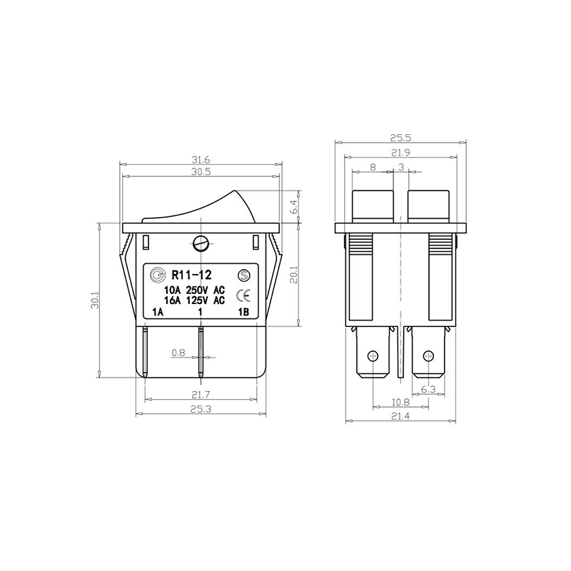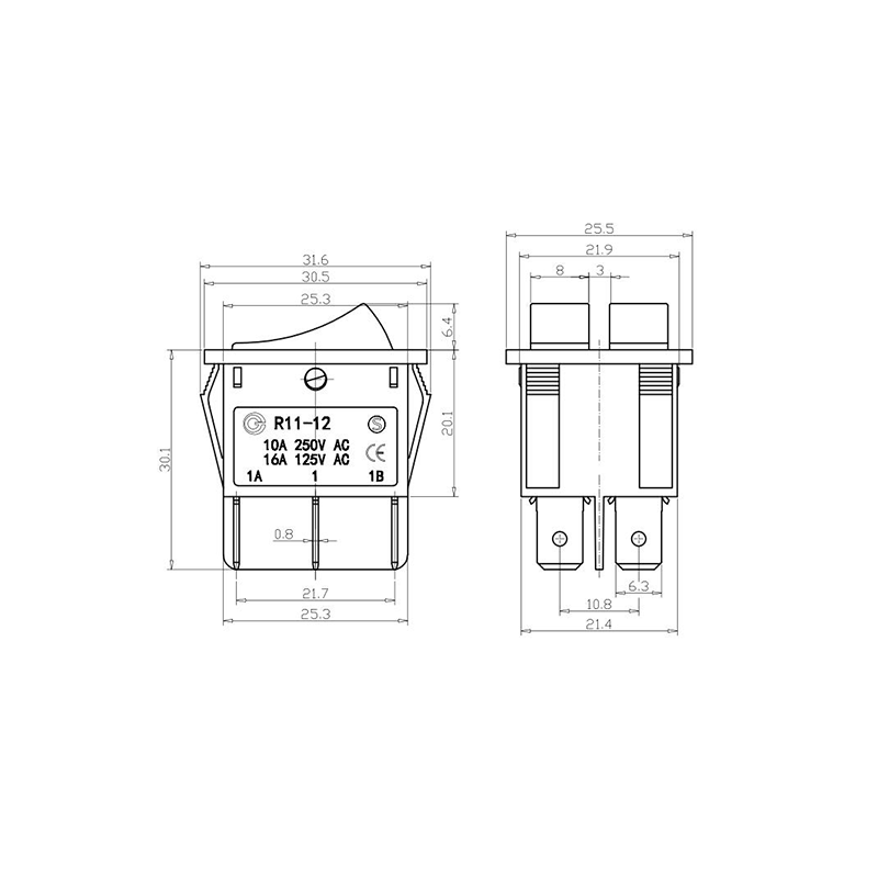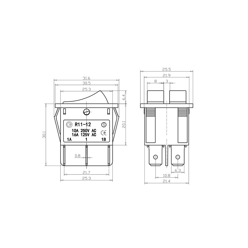 Shanghai Qijia Electronics Co., Ltd. Home / Products / Rocker Switch / R11 Rocker Switch / R11-12 Dual-Pole Toggle Rocker Switch