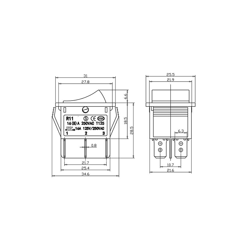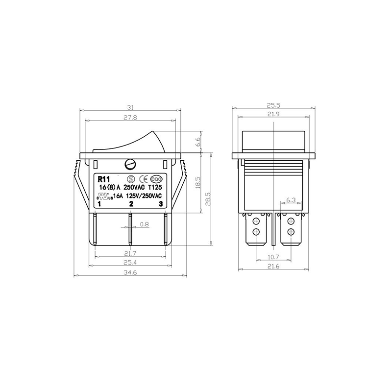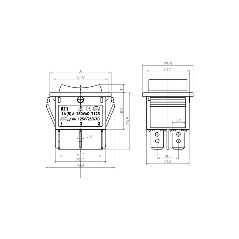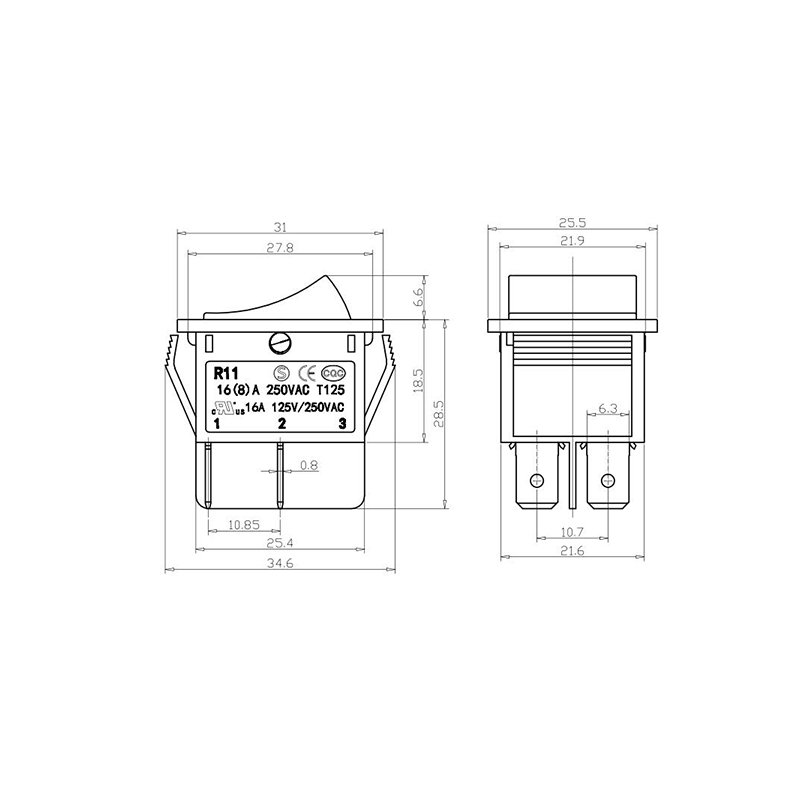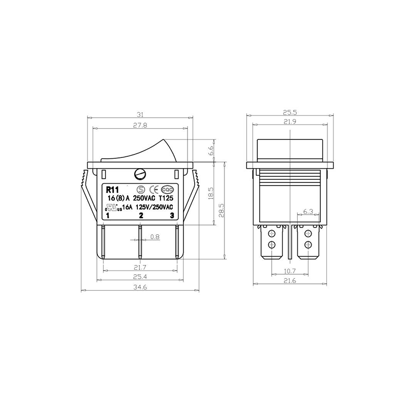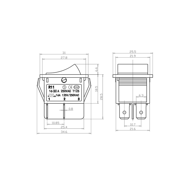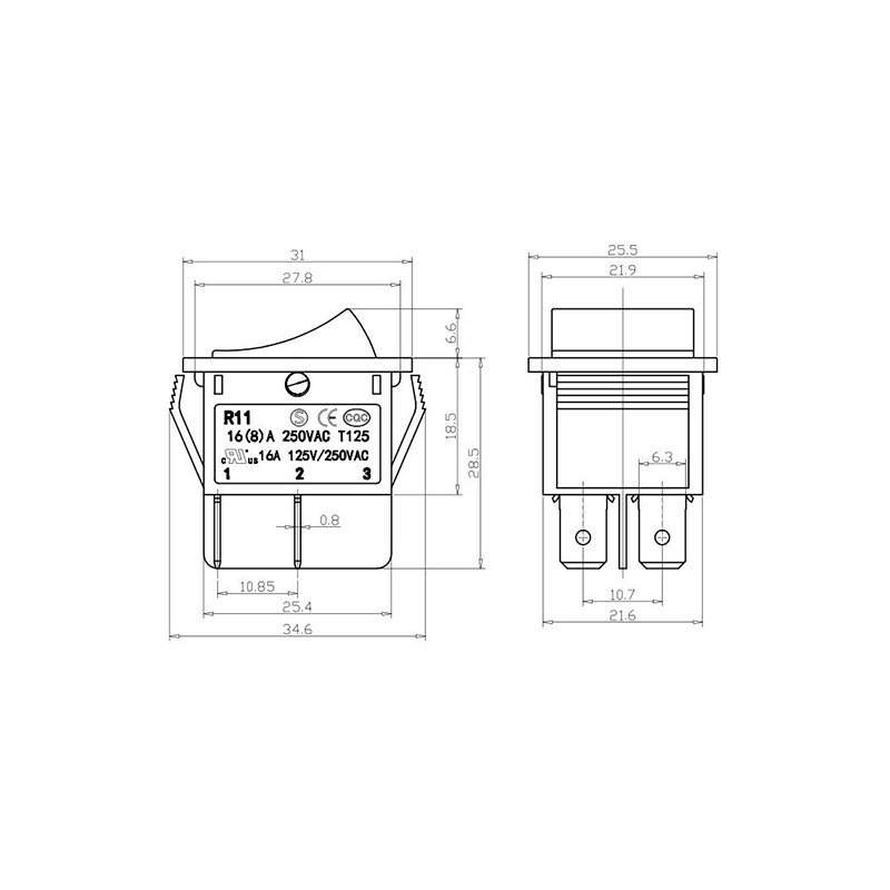 Shanghai Qijia Electronics Co., Ltd. Home / Products / Rocker Switch / R11 Rocker Switch / R11-22 3-Position Rocker Switch