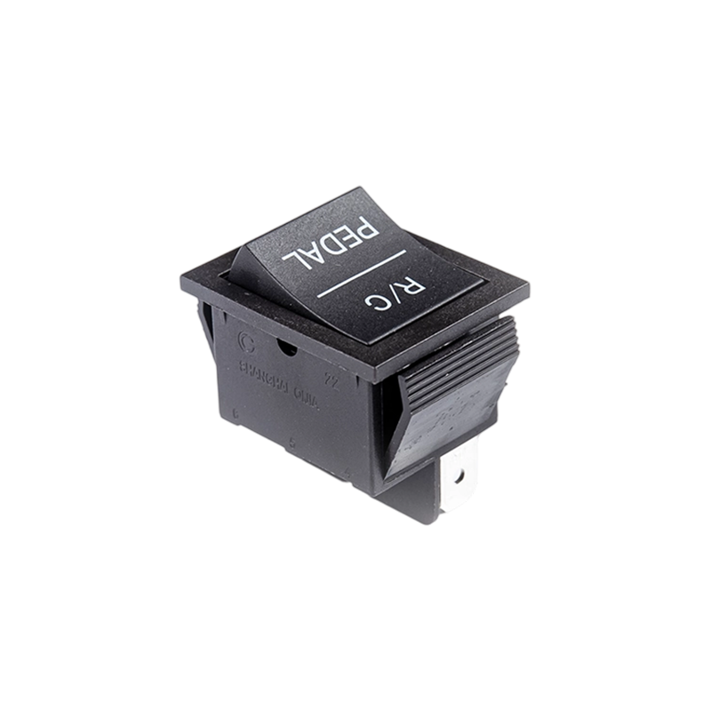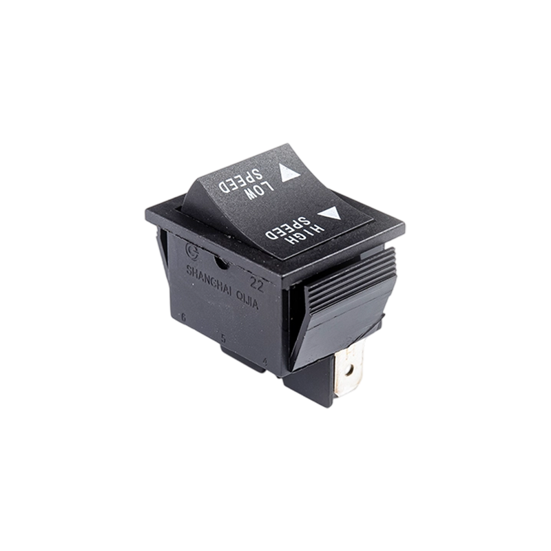 The R11-22 three-position rocker power switch features a user-friendly design with clear labeling for “High Speed,” “STOP,” and “Low Speed” settings, making it ideal for applications requiring variable speed control. Its standardized terminal configuration allows for easy panel mounting, providing excellent versatility across different devices.