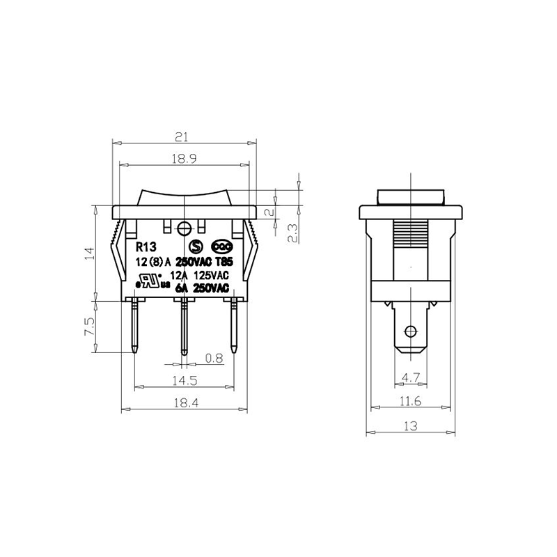 The R13-13 Office Equipment Rocker Switch series is a compact and versatile rocker switch designed specifically for small appliances and office equipment. Its compact form factor allows easy panel integration in precision devices. The housing is made from high-strength flame-retardant plastic, ensuring durability under frequent use and high-temperature conditions. The rocker actuator is ergonomically designed, enabling smooth toggling with minimal effort.